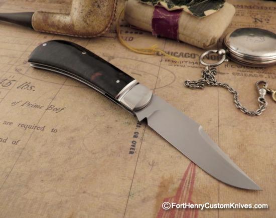 This Lanny’s Clip design is a bit on the large side ~ it has an Extremely Solid build, tough enough for any Daily Utility or small Game cutting chore. Ricardo chose some Vintage Rag Micarta for this one, it has swirls of Dark Brown, Black and some Gold.