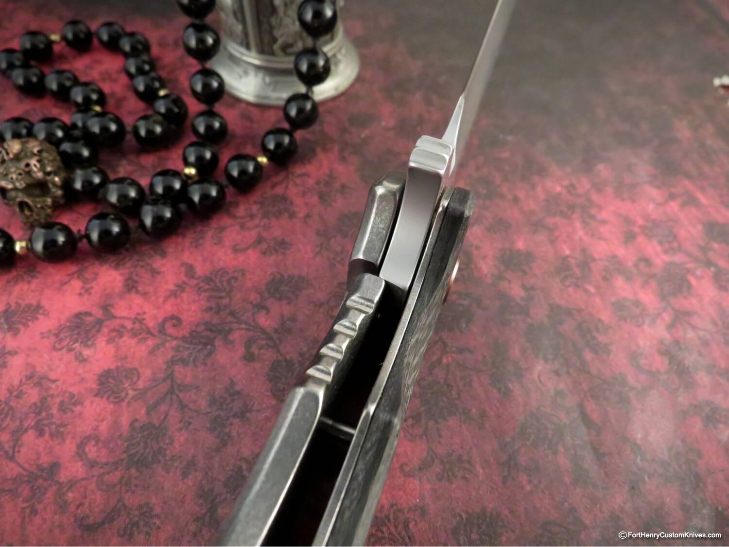 Look closely in front of the Thumb Stud and you will see the blade has S35VN Steel block letter designation etched into the blade. This one also has an Anodized Lock Bar Stabilizer. The knife rides snugly in your pocket. The Low Rider Titanium pocket clip is set for Tip Up carry.