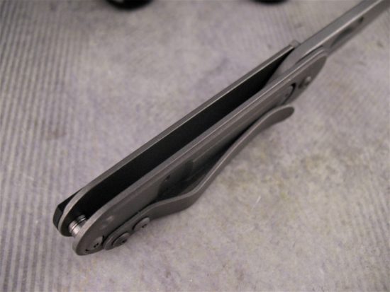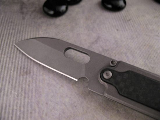 The action just right on this knife, the pivot can be loosened or tightened but this one is perfect the way it is. The size of the handle insures room enough for a Three Finger Grip, also the Full Titanium scales have carbon Fiber onlays on the front to help improve the grip of the knife. The extended Tang sits completely down into the handle to insure a comfortable grip.