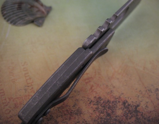 The blade of this friction folder is made from Thick AEB-L. The size of the handle insures room enough for a Three Finger Grip, also the Full Titanium Frame has a Titanium Backstop on the front to help improve the grip of the knife.