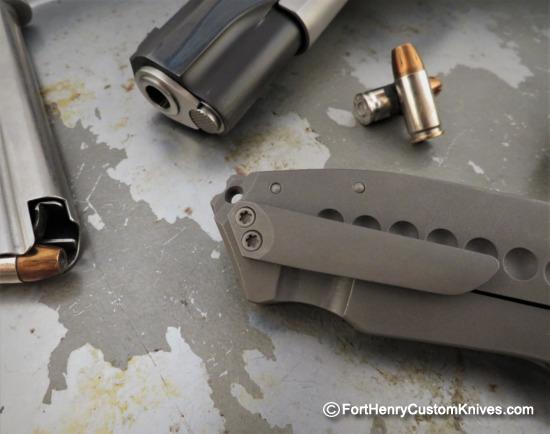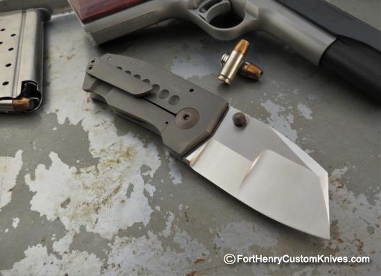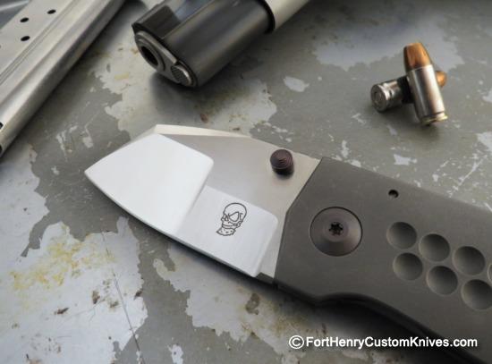 The Blade on this Steve Karroll Fatty SES has a Custom Two Tone finish with a Machine Satin on the Bevels and a Very High Satin Polish on the Flats. The CPM154 blade is Razor Sharp and Precision Ground. This Stout blade opens Smoothly due to the Caged Internal Bearing system. It also comes with Custom Anodized Titanium, Dual Thumb Studs.