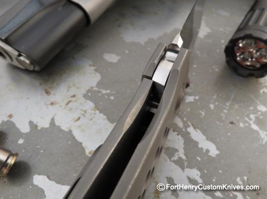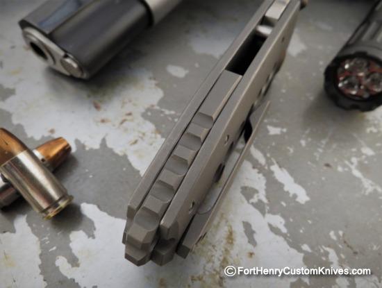 The contoured and sculpted Titanium Frame is Deeply stonewashed for durability. Note the Thick Titanium Backspacer also has Traction Ridges for enhanced Security.