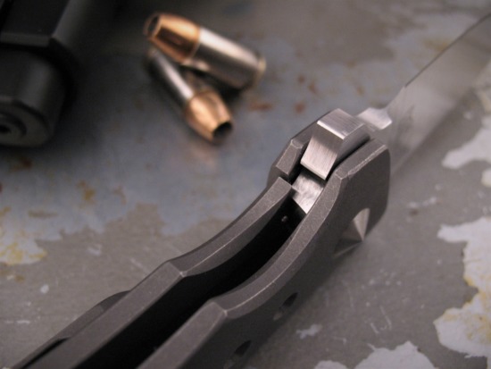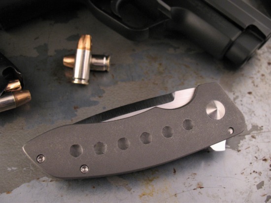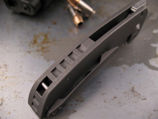 The Custom Milled Titanium Backspacer (with hidden Lanyard Bar) adds strength to the design without adding alot of weight.