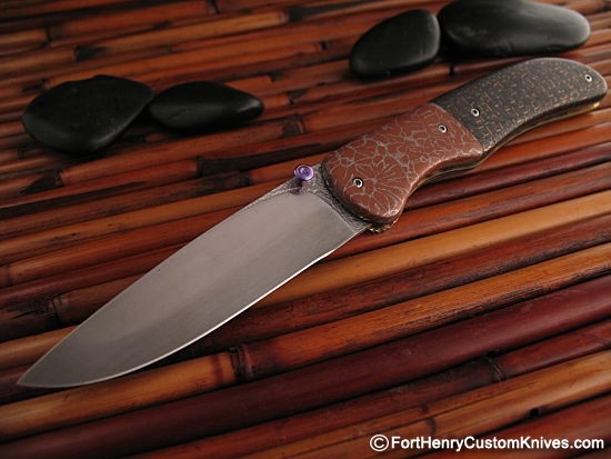 The knife has a Full Titanium Anodized Frame with Lightning Strike Carbon Fiber handle scales and the new Space Age M3 Copper Mokume Metal Bolsters.