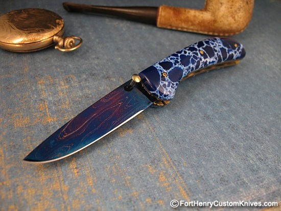 The knife has striking Reconstituted Lapis Lazuli Stone handle scales. The blade is Hot blued Alabama Forge High Carbon Damascus that has a very unique appearance.