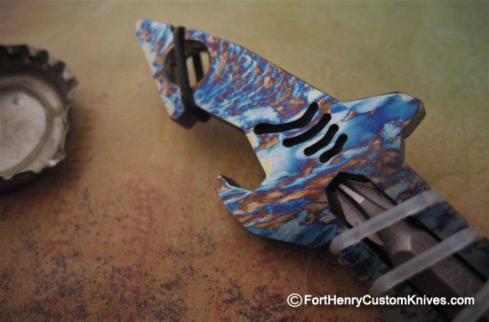 I am a sucker for cool multi tools and when I saw this one I knew I had to get some to put on my website. This is an Exciting Titanium Key Chain Tool that Thompson Knife & Tool (the same Maker of the popular Pry-Ahna) recently produced this EXCLUSIVELY for The Fort ~ called the Ti-Grr Shark