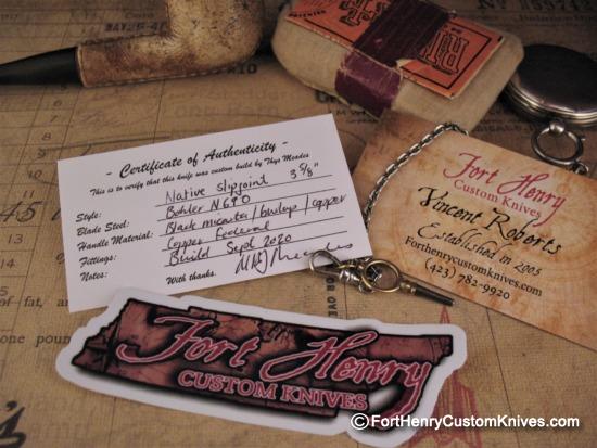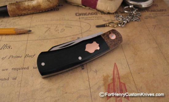 Thys Hand Crafted this incredible Native Model Slipjoint with an expert eye toward material combination. He chose a wonderful combination of Black Micarta, Burlap Micarta and Copper!