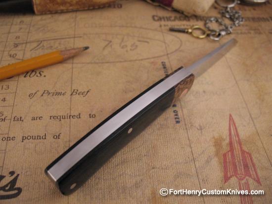 The Blade has superb “Walk and Talk” and the Half Stop is very secure. The Bohler N690 Blade on this Thys Meades Native Slip Joint has a Labor Intensive Hand Rubbed Finish and a Full Height Hollow Grind with Dramatic Custom Swedge.
