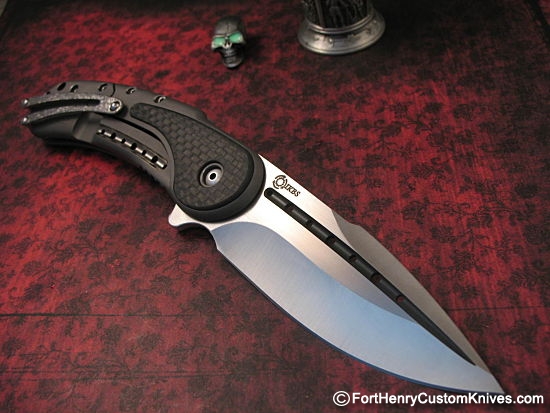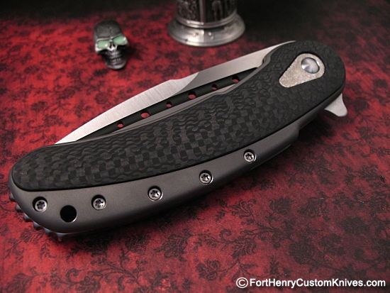 The Carbon Fiber handle helps to lighten the weight of this big  knife and looks great in contrast to the Ti handle.