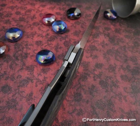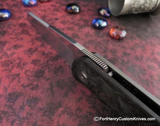 Just a bit of pressure on the flipper mechanism causes the blade to Leap into the Open and Locked Position! Wonderful Balance, Top Shelf Materials and Caged Internal Bearings ~ this knife ticks all the boxes. The handles on this small group are are light weight Fat Carbon Arctic Storm Carbon Fiber and each knife is different.