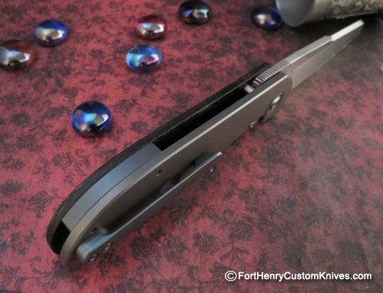 The Contoured Scales and subtle Thumb Ridges on this Trevor Burger LEXK CFL make for a very secure Full Hand Filling Grip. A Lovely Anodized half length Titanium backspacer matches the Clip.