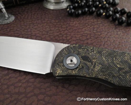 Just a bit of pressure on the flipper mechanism causes the blade to Leap into the Open and Locked Position! Wonderful Balance, Top Shelf Materials and Caged Internal Bearings ~ this knife ticks all the boxes. The handles on this small group are are light weight Fat Carbon Mosaic Gold ~ Carbon Fiber and each knife is different.
