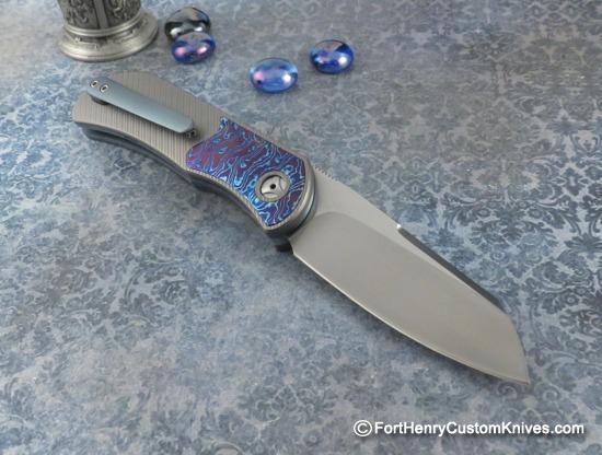 The blade on this Trevor Burger EXK+ Front Flipper is Hand Ground from tough M390 which Trevor gave a Labor Intensive Hand Rubbed finish.  The handle is Titanium with Gorgeous Timascus Bolsters. As with all Burger Knives I have held, this one has wonderful Balance and features Internal Ceramic Bearings ~ Needless to say, the Action is Incredible!
