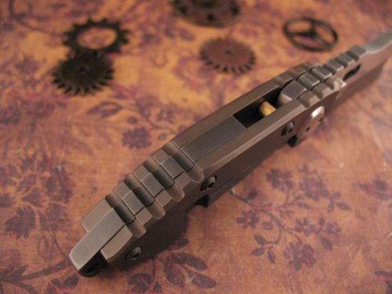 The Contoured Titanium Frame is Anodized Bronze for a dark contrast. This Tiny blade was Hand Ground from CPM-D2 Steel, it has a Flat Ground Bevel with a Wide Tang.
