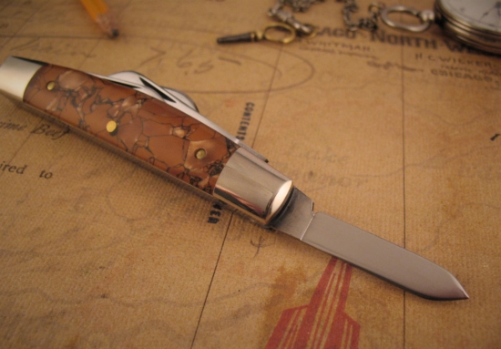 The Model of this knife is #613409 ~ it has beautiful “Looking Glass Grandma’s Kitchen Floor” handles, and High Polished Bolsters. This particular example is Serial Number 24 from the first Factory Test Production Run