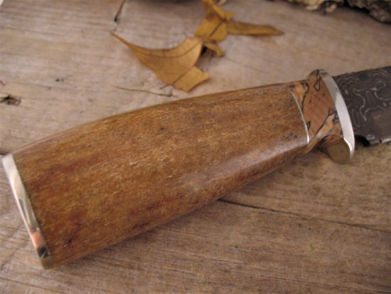 Herb explained that his high contrast – High Carbon Damascus blades have over 2,500 layers. The knife has a comfortable Full Grip handle molded from a Large Single piece of of Fossilized Stellar Sea Cow Rib Bone.  This knife is Sized for a Med to Large Grip, or would work well if you wear gloves.