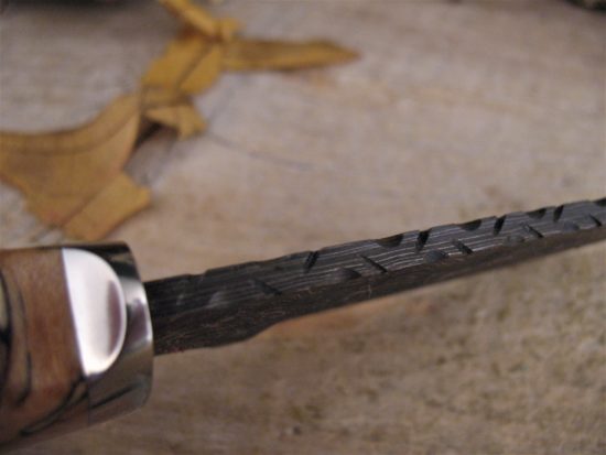 On this knife Herb has also added some Vine Filework on almost the entire length of the Spine which looks great but serves a dual purpose of also replacing Thumb Ridges for grip enhancement.