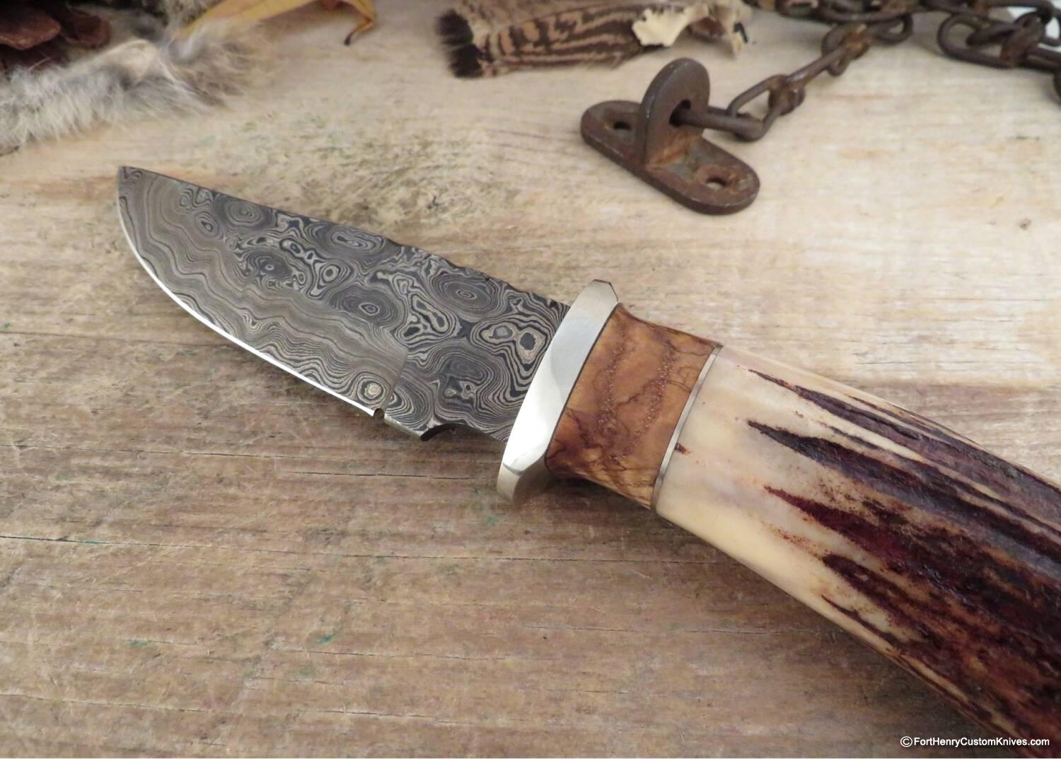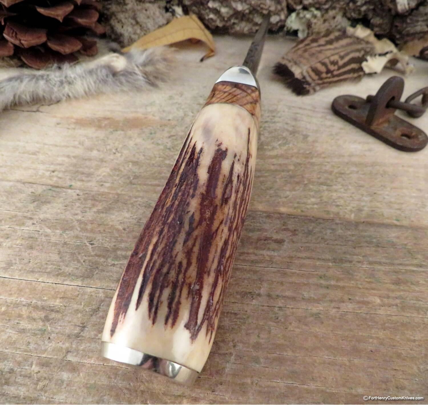 The Incredible Sambar Stag handle on this Derr Cascade Clip Point Hunter is truly remarkable. Since the embargo against the Import of Sambar Stag over a decade ago, Stag of this quality is impossible to find. Note the Incredible natural Color and Gnarly Grain. The Handle material is flanked by Nickel Silver Spacers and a Stabilized Maple Burl spacer for color.