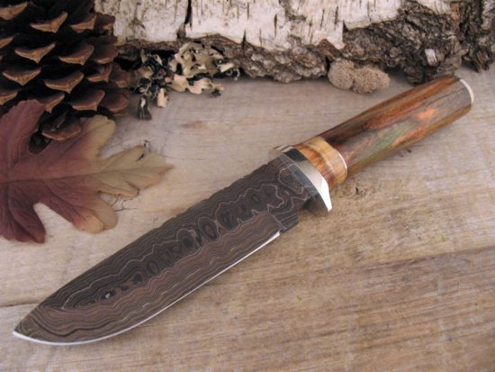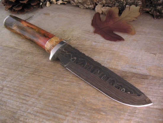 Here is a Large Drop Point Hunter from Herb that has high contrast Sole Authorship Random Pattern Damascus. This is a great looking knife knife with artistic attributes, but I guarantee it will perform as good as it looks.