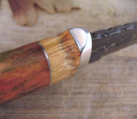 The handle is flanked by Nickel Silver Spacers and a Stabilized Myrtle Burl forward spacer which adds a dash of contrast to the handle. Note, this one also has a Double Guard for extra security.