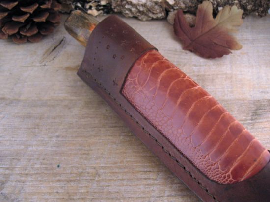 The Heavy Leather RH Belt sheath has an African Ostrich Leg Skin inlay along with Custom Tooling around the mouth of the Sheath. Nice snug fit and a wonderful compliment to the knife.