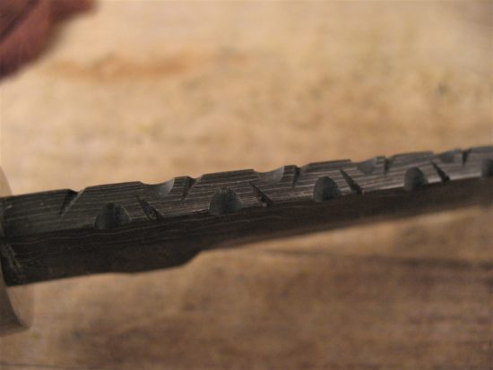 On this knife Herb has also added some Vine Filework on almost the entire length of the Spine which looks great but serves a dual purpose of also replacing Thumb Ridges for grip enhancement.