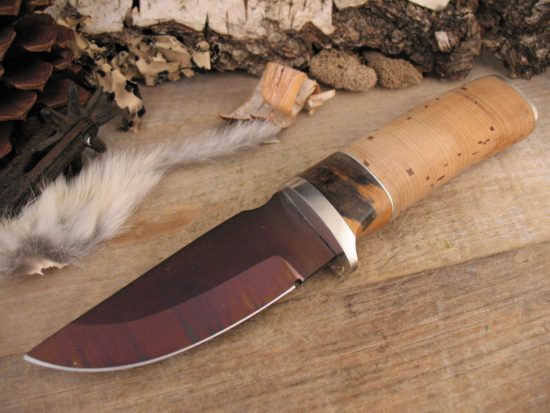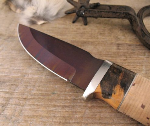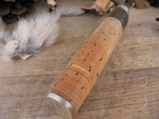 The Birch Bark must be Harvested, Dried and then Cut and Stacked Tightly before using. Once on the knife it is lightly Sanded to Shape – this handle is best suited for a Med to Large Grip.