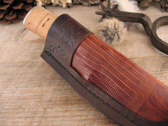 The Heavy Leather RH Belt sheath has an exotic Lizard Skin inlay along with Custom Tooling around the mouth of the Sheath. Nice snug fit and a wonderful compliment to the knife.