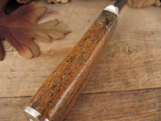 The Fossilized Stellar Sea Cow Bone handle has rich color and beautiful natural grain. HERE is a link to some information on the extinct Stellar Sea Cow.  The Handle material is flanked by Nickel Silver Spacers and a Stabilized Buckeye Burl spacer for color.