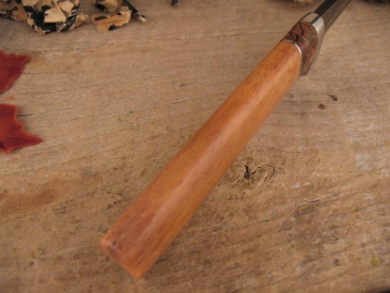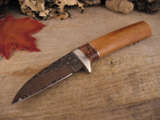 On this knife Herb has expertly polished the handle and contoured the Nickel Silver Guard for a very comfortable grip. The Beautiful Damascus Wharncliff Blade is approx 1/8″ Thick and has enough cutting edge for any everyday chore.