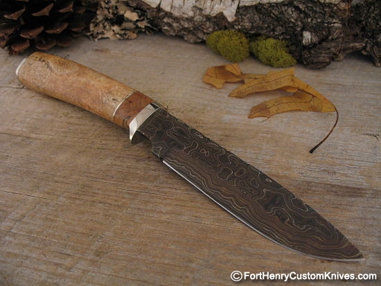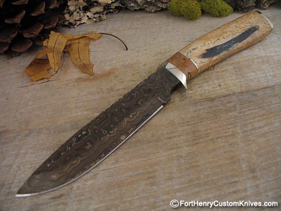 Here is another Sole Authorship piece from Herb, it is a Long Hunter that he has forged with his Birds Eye Pattern Damascus.  This is a knife with artistic attributes, but I guarantee it will perform as good as it looks.