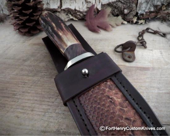The Heavy Leather Belt sheath has an Boa Constrictor Snake Skin inlay and it has a Removable Belt Loop so that the Sheath can also be carried in the Boot! Nice snug fit and a wonderful compliment to the knife.