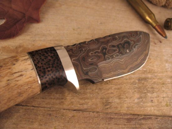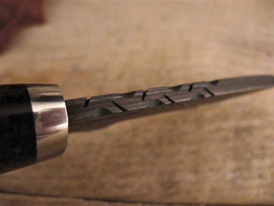 Herb explained that his high contrast Carbon Damascus blades have over 2,500 layers. The blade on this big Skinner is 1  1/4″ Wide!