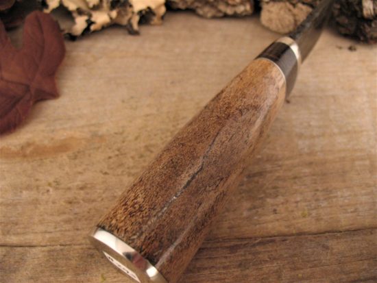 Here is rare Sole Authorship piece from Herb, it has a thick, Straight Spine with a big Bullnose tip. Herb forged this with some of his best Bird’s Eye Damascus.