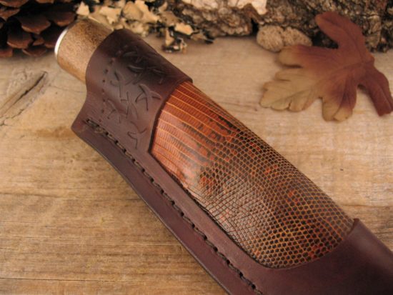 The Heavy Leather sheath has Exotic Lizard Skin as the inlay.  Herb also added some Custom Tooling around the mouth of the Sheath. Nice snug fit and a wonderful compliment to the knife.