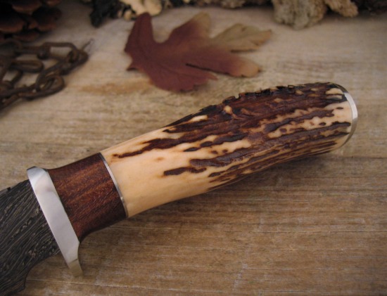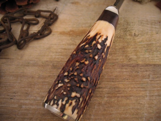The knife has a Nickel Silver Guard with a Subtle Top Thumb Rest. The Dark Stabilized Curly Maple Spacer in front is a nice contrast to the Gorgeous Sambar Stag handle. This is an amazing piece of Stag ~ since the Embargo more than a decade ago on the Export of Sambar Stag from India ~ Fat, Gnarly Stag like this is long gone from today’s market.