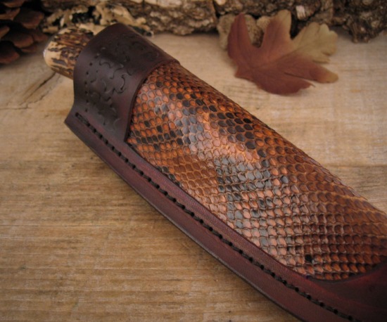 The Heavy Leather Belt sheath has an Boa Constrictor Snake Skin inlay along with Custom Tooling around the mouth of the Sheath. Nice snug fit and a wonderful compliment to the knife.