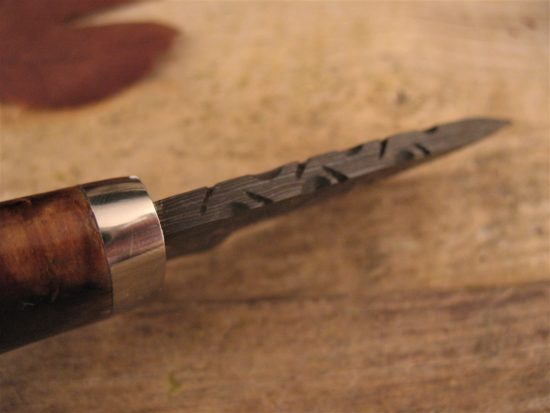 I have been a Dealer for Herb Derr Custom knives for over a decade, long before I had a website I sold Herb’s knives at Gun & Knife Shows, most often to repeat Customers.  Herb’s pieces are sole authorship ~ he forges his own Damascus, grinds his own blades, makes his own Leather Sheaths and still finds time to Teach courses at a Community College on how to make Damascus.