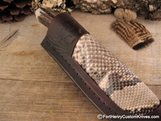 The Heavy Leather RH Belt sheath has an exotic Snake Skin inlay.  The knife rides snug and deep to prevent loss.