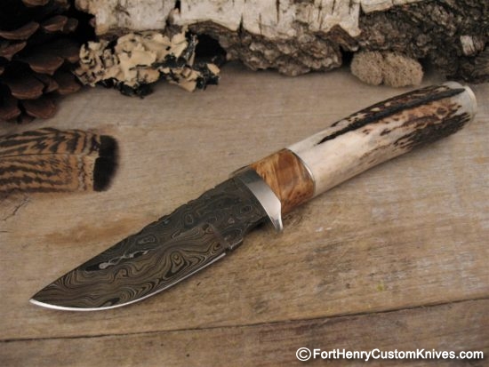 This special knife has Herb’s High Carbon Birds Eye Damascus that is over 2,500 layers thick and a gorgeous Sambar Stag handle.