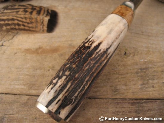 This beautiful Stag handle has dark gnarly grain and a wonderful swell from the Mid Line to the back that fills the hand nicely!  The Stag is flanked by Nickel Silver Spacers and a thick Stabilized Maple Burl wood spacer for color.