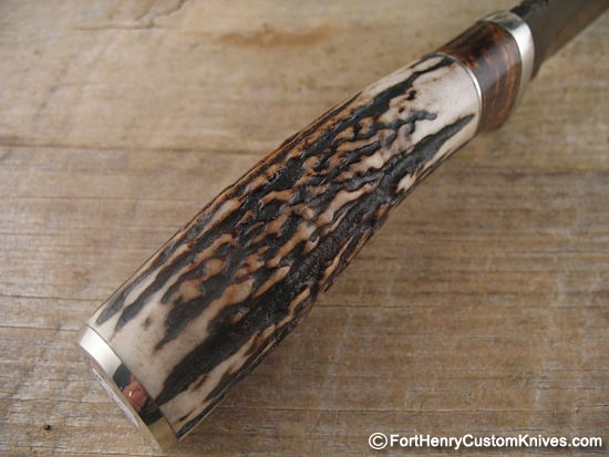 This beautiful Stag handle has dark gnarly grain and a wonderful swell from the Mid Line to the back that fills the hand nicely! The Stag is flanked by Nickel Silver Spacers and a thick Stabilized Redwood Burl spacer for color.
