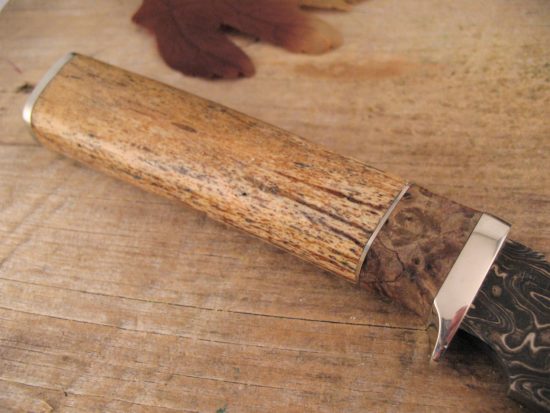 The Rib Bone handle is flanked by a Nickel Silver Spacer and a gorgeous Stabilized Box Elder Burl spacer for color. This knife also has a Subtle Top Guard for Thumb Placement.