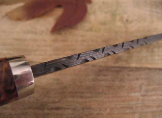 Here is another Sole Authorship piece from Herb, it is a Long Hunter that he has forged with his Birds Eye Pattern Damascus. This is a knife with artistic attributes, but I guarantee it will perform as good as it looks.