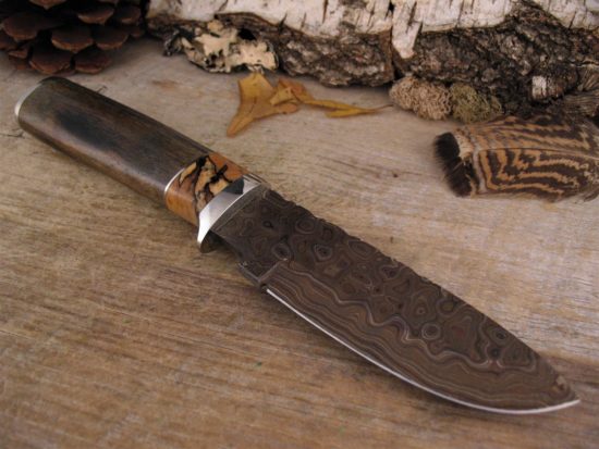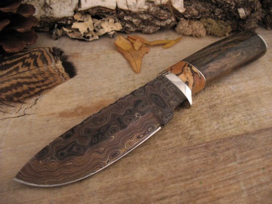 Herb’s Hand Forged – High Carbon Damascus is over 2,500 layers thick. This one has an Expert Etch that clearly shows the especially striking Birds Eye Steel Pattern.