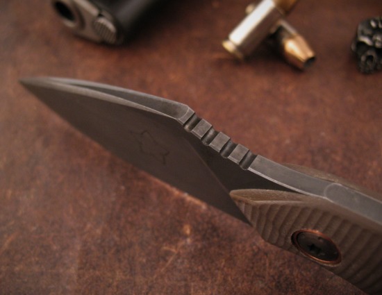 The Forefinger Guard, the Deep Integral Thumb Recess and Thumb Ridges all combine to create an extremely secure grip in both the Forward and Reverse Positions. Note, the Blade also has a Custom Fuller along the Spine to channel any material.