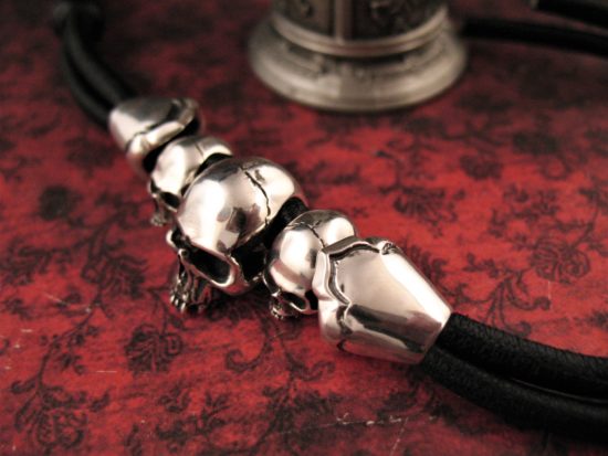 This unique Custom Skulls Bracelet has both Sterling Silver Cast Skulls and Sterling Silver Cast Keepers over a Smooth leather bracelet.