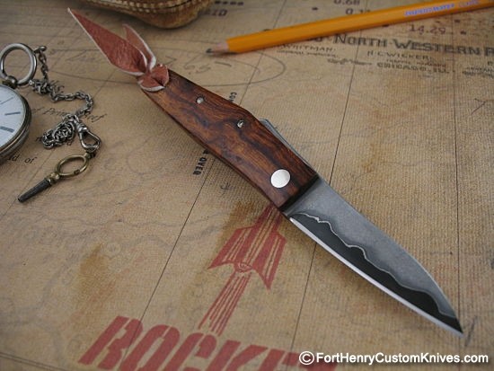 This example by Hiroaki is a Mini Friction Folder (about 1/4″ smaller than his normal size. He gave this one hand carved Presentation grade Desert Ironwood handles. It has a very smooth action and Hiroaki has designed the handle to resemble a Dog’s Hind Leg so that it fits in the hand very comfortably.