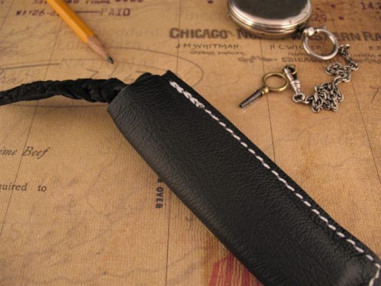 Hiroaki makes his own Leather Pocket Sheaths for every knife, well stitched and holds the knife securely.
