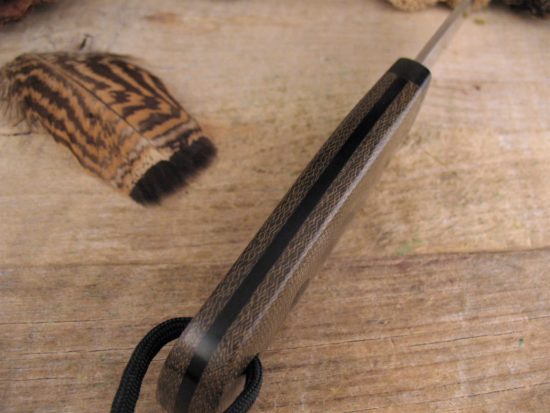 For the handle scales Hiroaki chose some great looking Canvas Micarta that has Excellent Wood Like Grain. The handle has unique, Hand Filling contours, the Guard and Bolt Covers are tough Black Micarta.